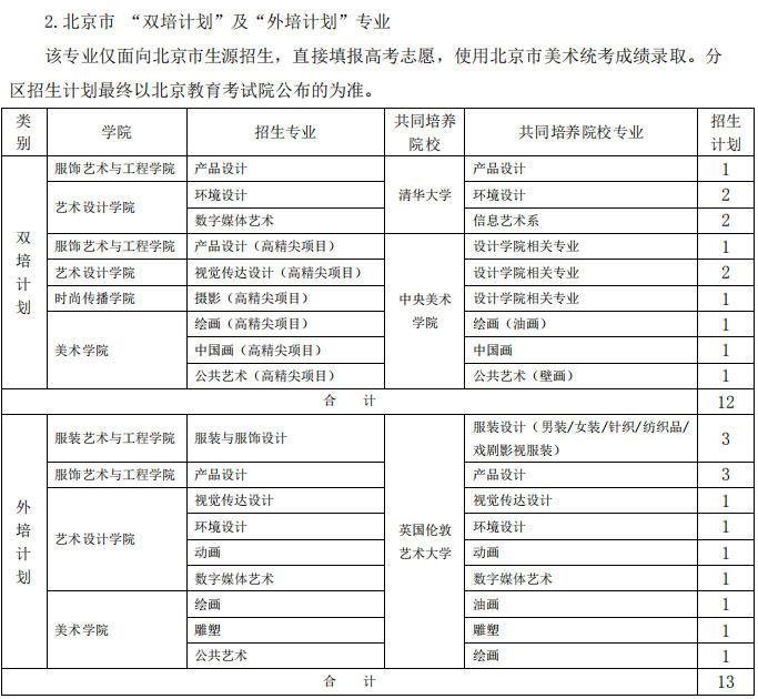 2.北京市“双培计划”及“外培计划”专业按照北京市美术统考考试成绩从高分到低分择优录取。“外培计划”要求外语科目成绩不得低于 90 分。